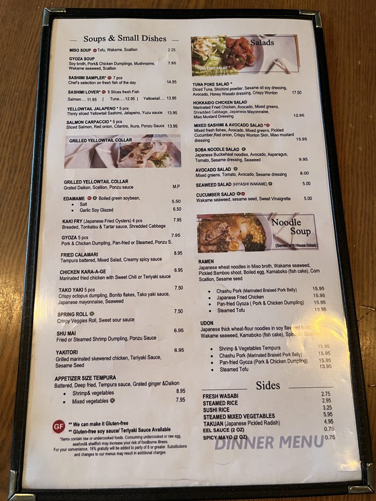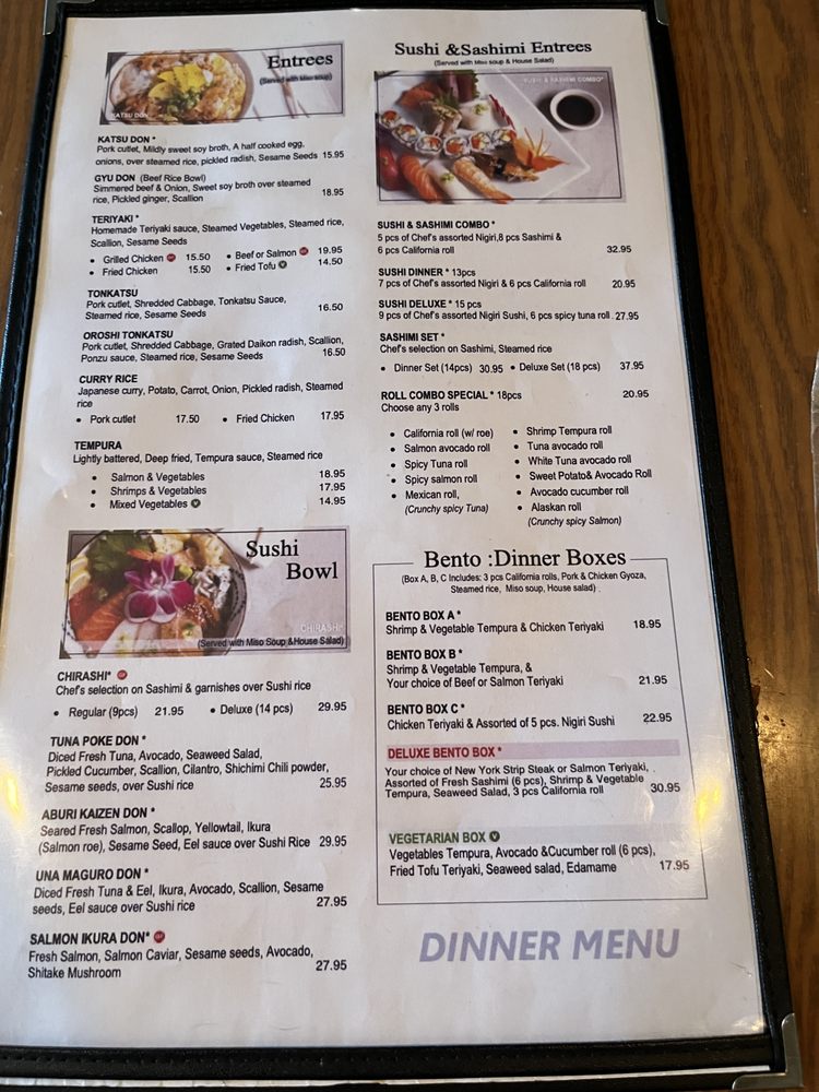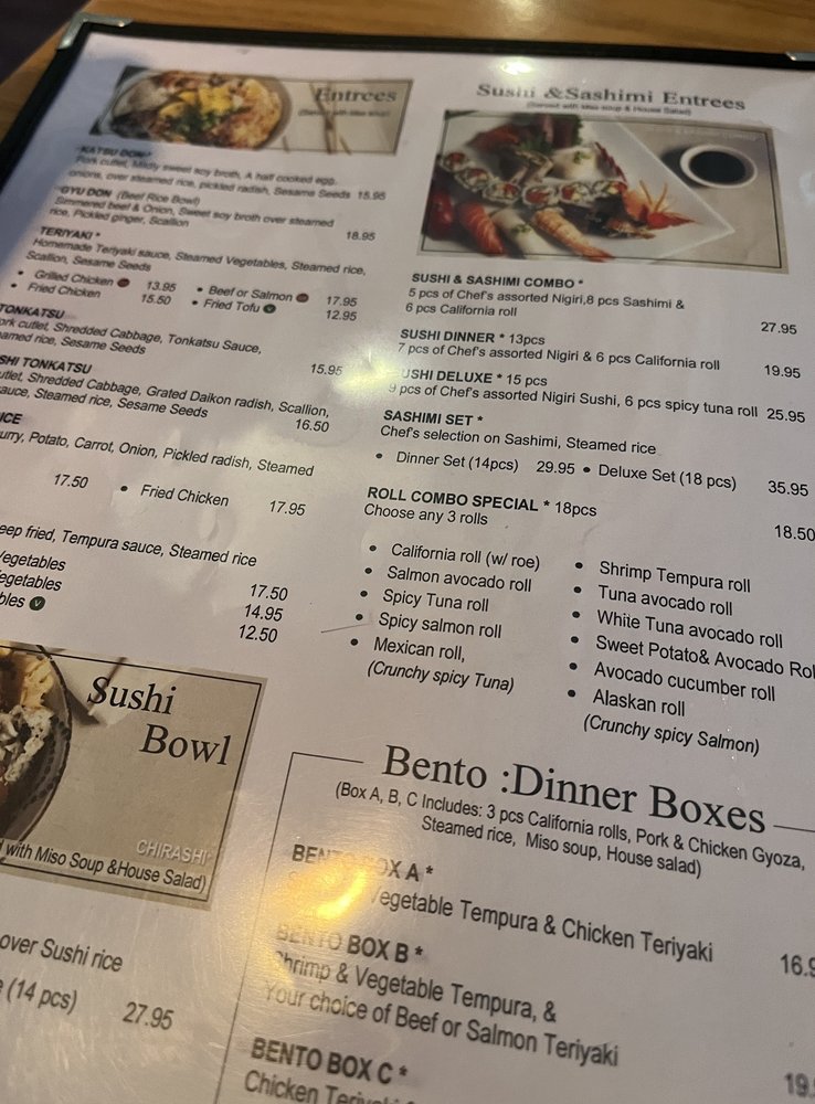 Assorted of sashimi six pieces, New York strip steak, shrimp and vegetable tempura, seaweed salad, and three California roll. Three pieces California rolls, pork and chicken gyoza, steamed rice, miso soup, and salad.